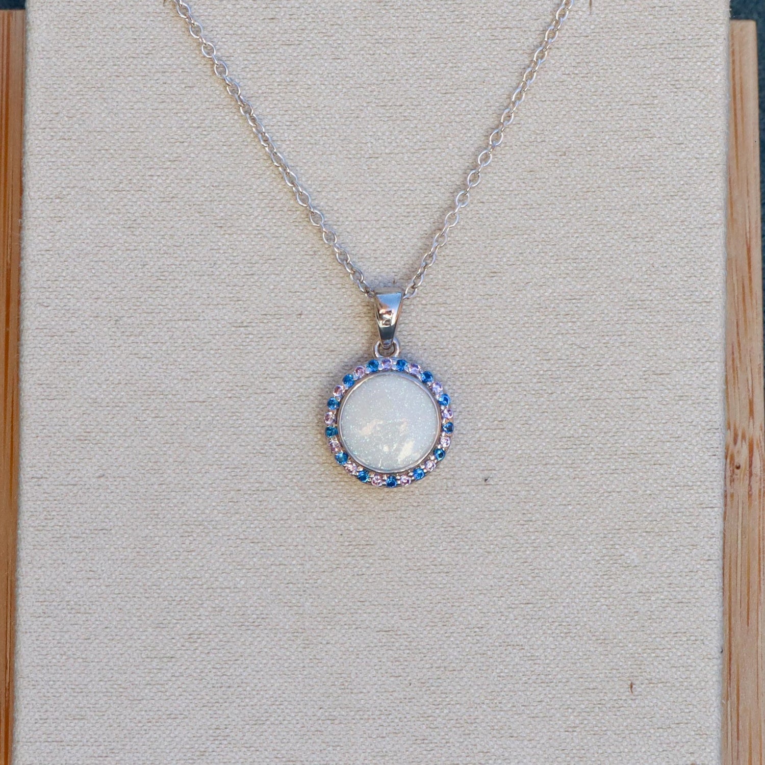 This radiant 8mm breastmilk pendant is a heartfelt tribute to motherhood, featuring a handcrafted milk stone encircled by a shimmering halo of Cubic Zirconia, designed to represent your baby’s birthstone. This custom piece is crafted from your own preserved breastmilk and set in .925 sterling silver, available in your choice of silver or rose gold finishes.